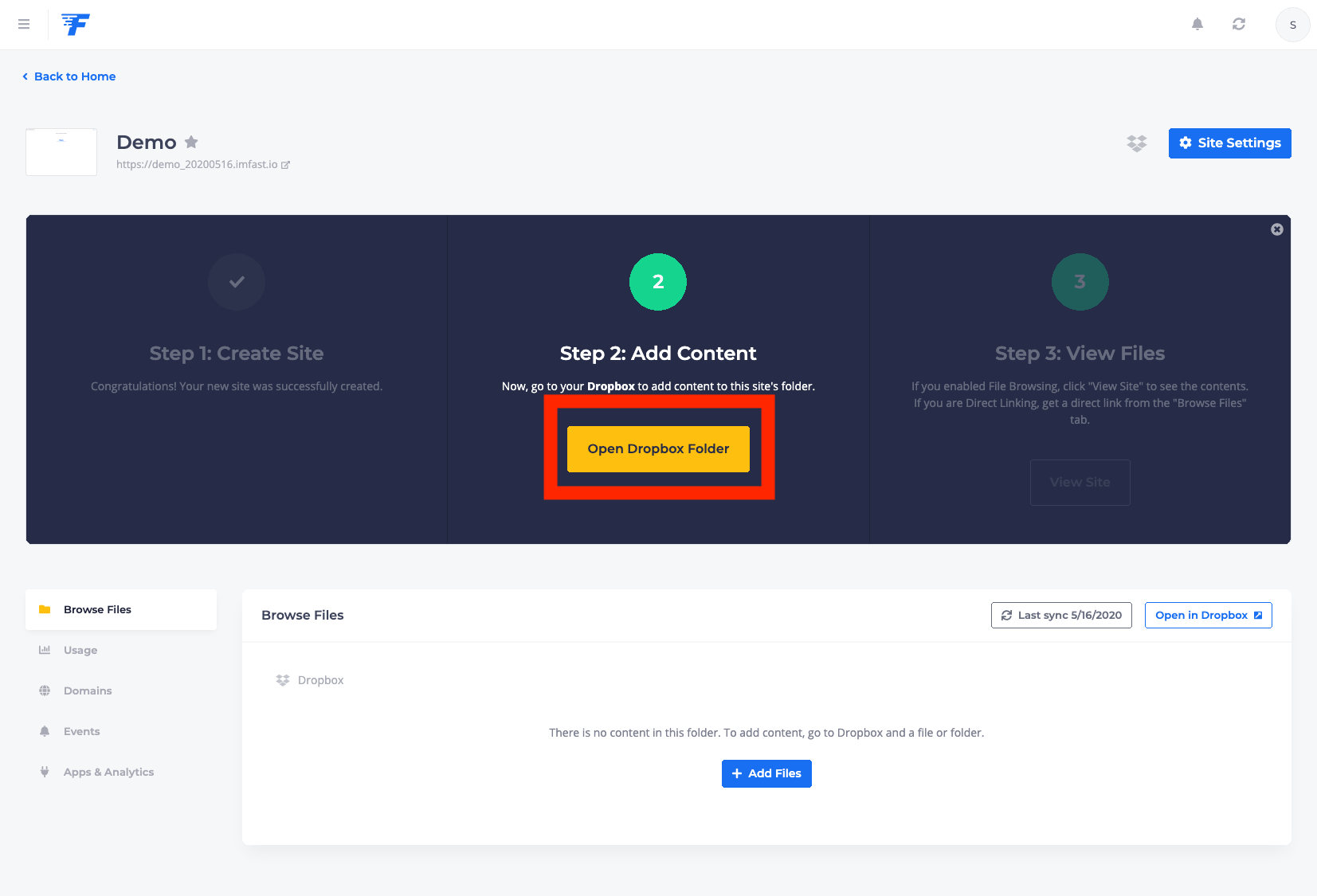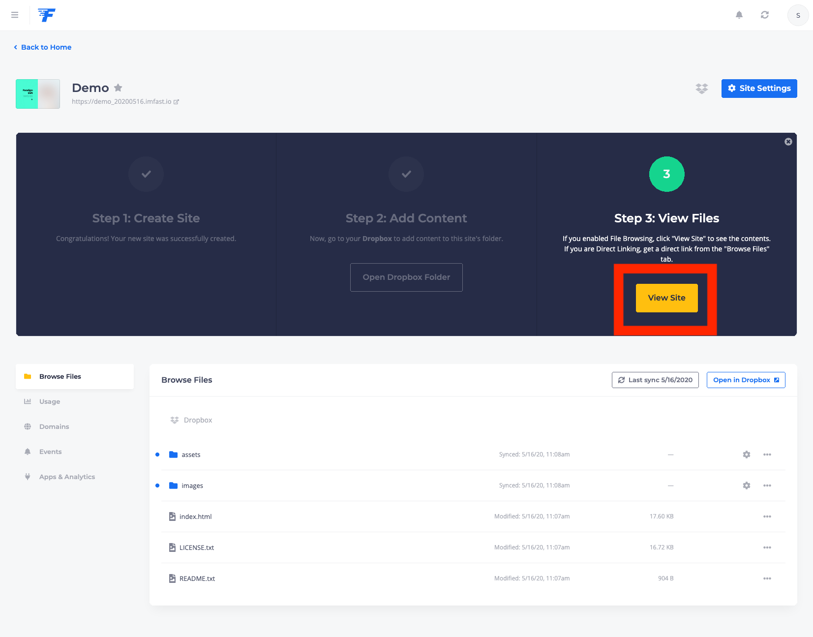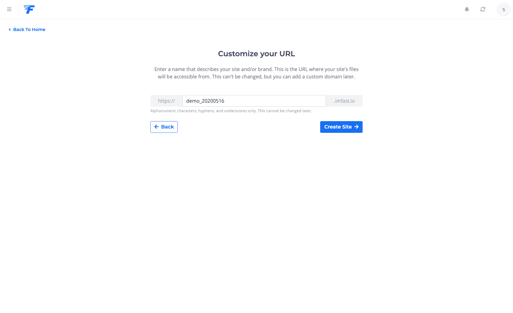 이제 클라우드 서비스랑 fast.io랑의 연결은 성공. 이제 어떤 사이트를 만들지 묻는 화면으로 넘어간다. 나는 demo_20200516이라는 사이트를 만든다고 설정했다. 이러면 최종적으로 홈페이지 주소는 https://demo_20200516.imfast.ion 가 된다. (이 설명서 작성 후에 사이트는 제거했으니 저 주소로 가봐야 뭐 안보일꺼다) "Create Site" 버튼 눌러 사이트 생성!!