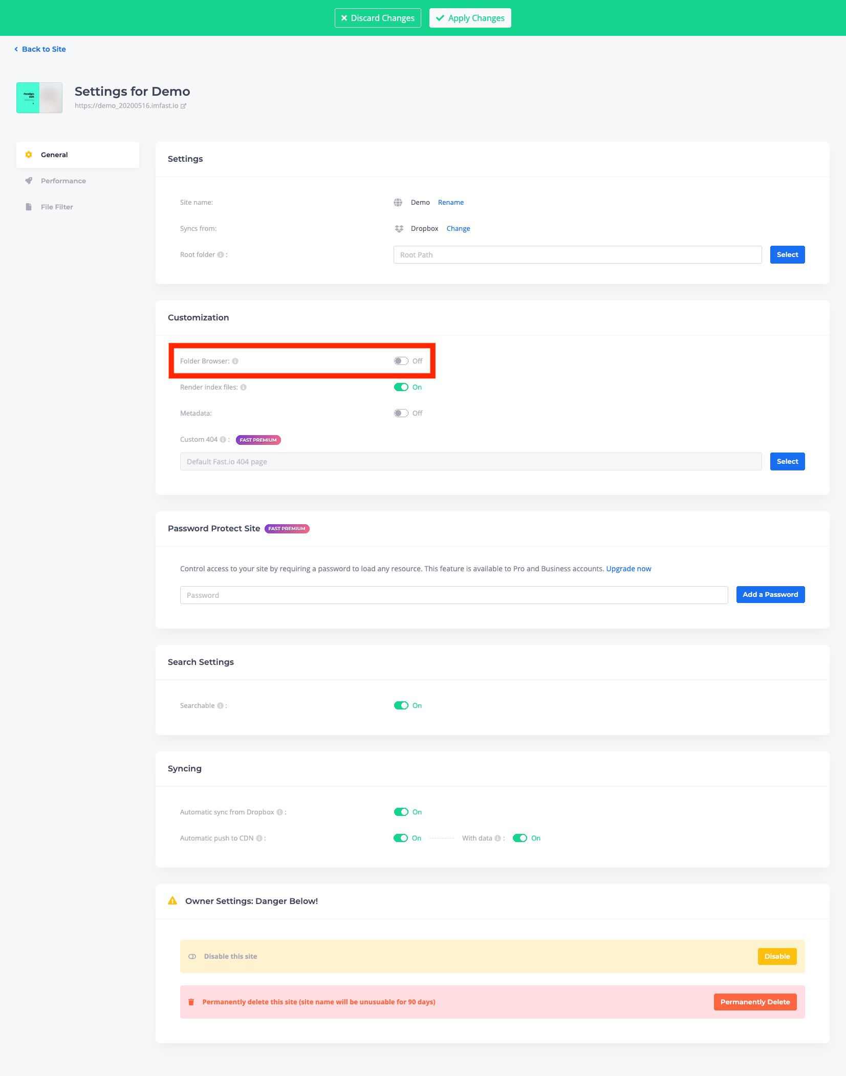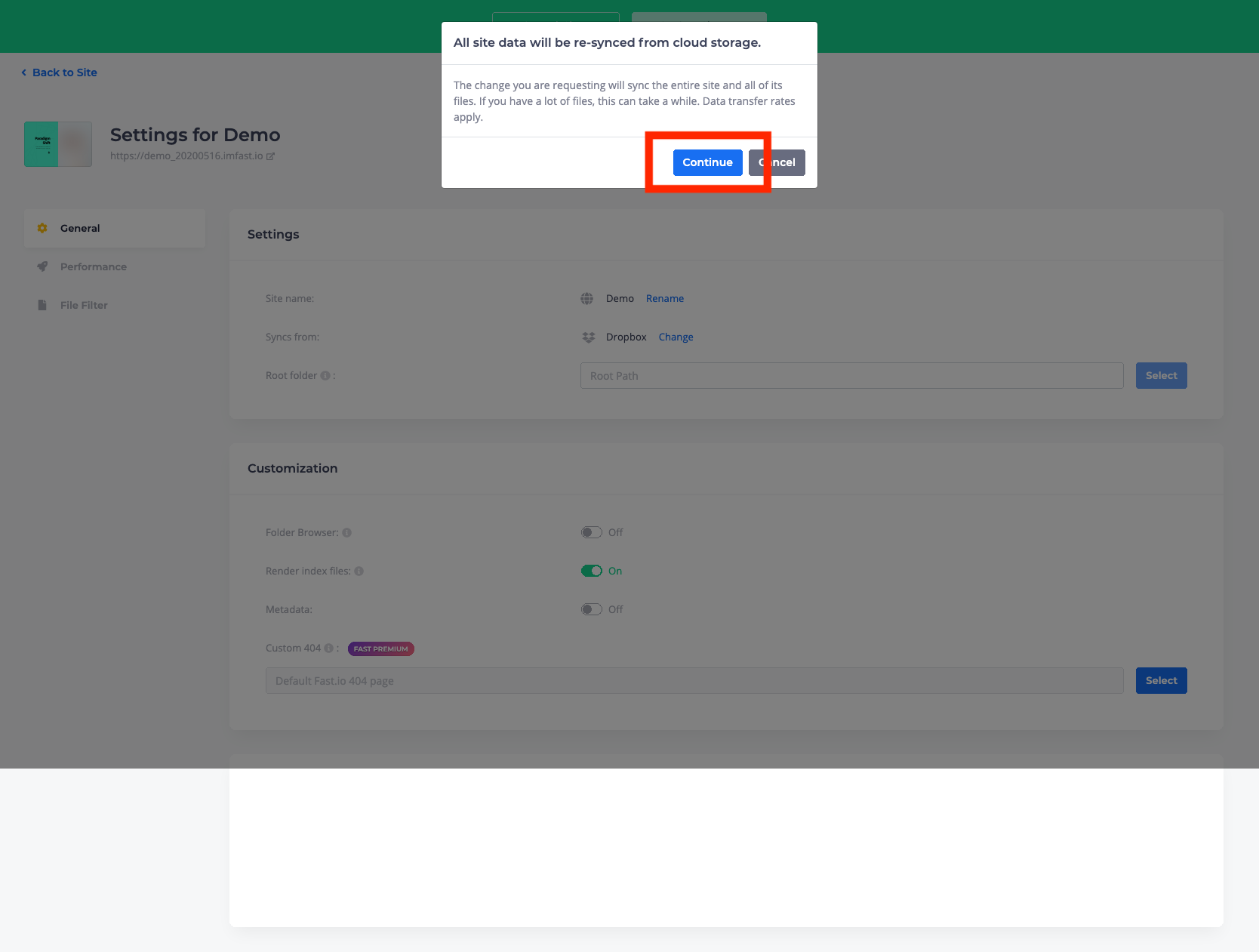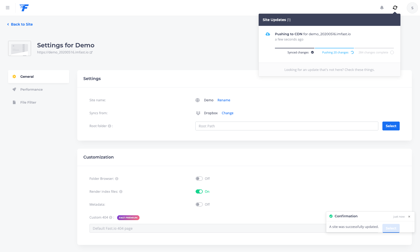이제 클라우드 서비스랑 fast.io랑의 연결은 성공. 이제 어떤 사이트를 만들지 묻는 화면으로 넘어간다. 나는 demo_20200516이라는 사이트를 만든다고 설정했다. 이러면 최종적으로 홈페이지 주소는 https://demo_20200516.imfast.ion 가 된다. (이 설명서 작성 후에 사이트는 제거했으니 저 주소로 가봐야 뭐 안보일꺼다) "Create Site" 버튼 눌러 사이트 생성!!