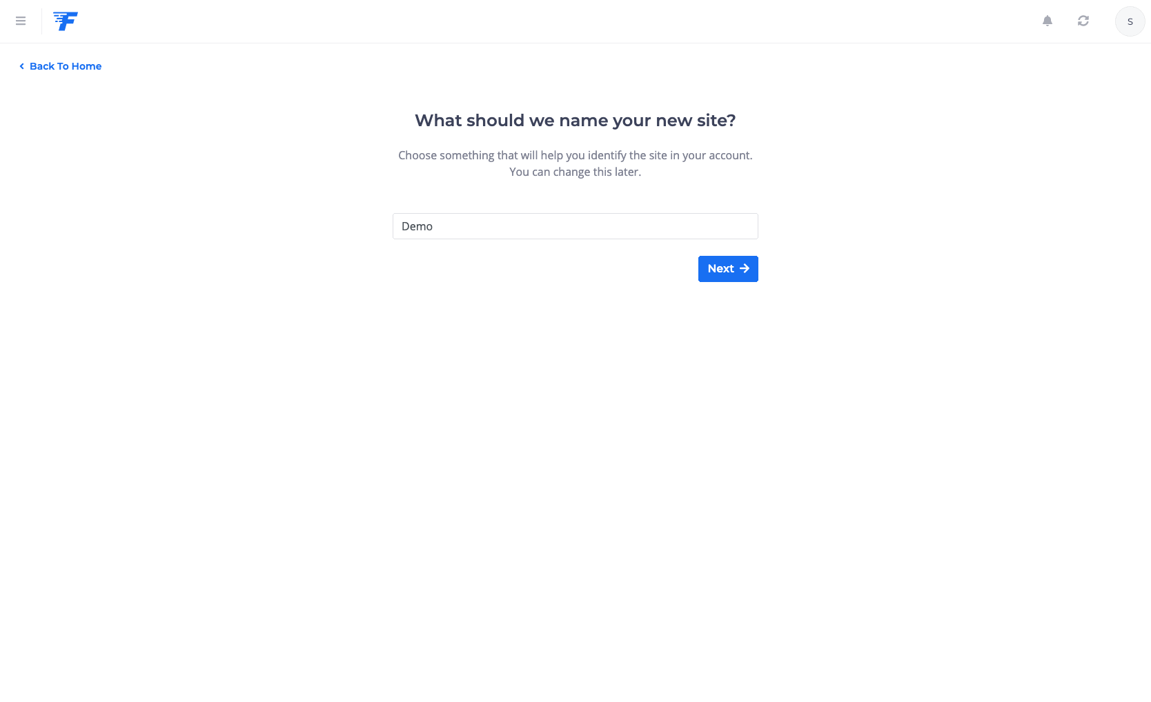 우선은 웹페이지 이름을 물어본다. 나는 설명을 위한 사이트를 만드는 것이니 Demo라고 이름 지었다. 이것이 최종 사이트 주소가 되는 것은 아니고 fast.io에서 사이트 관리하는 페이지에 표시되는 용도이다. Next!!
