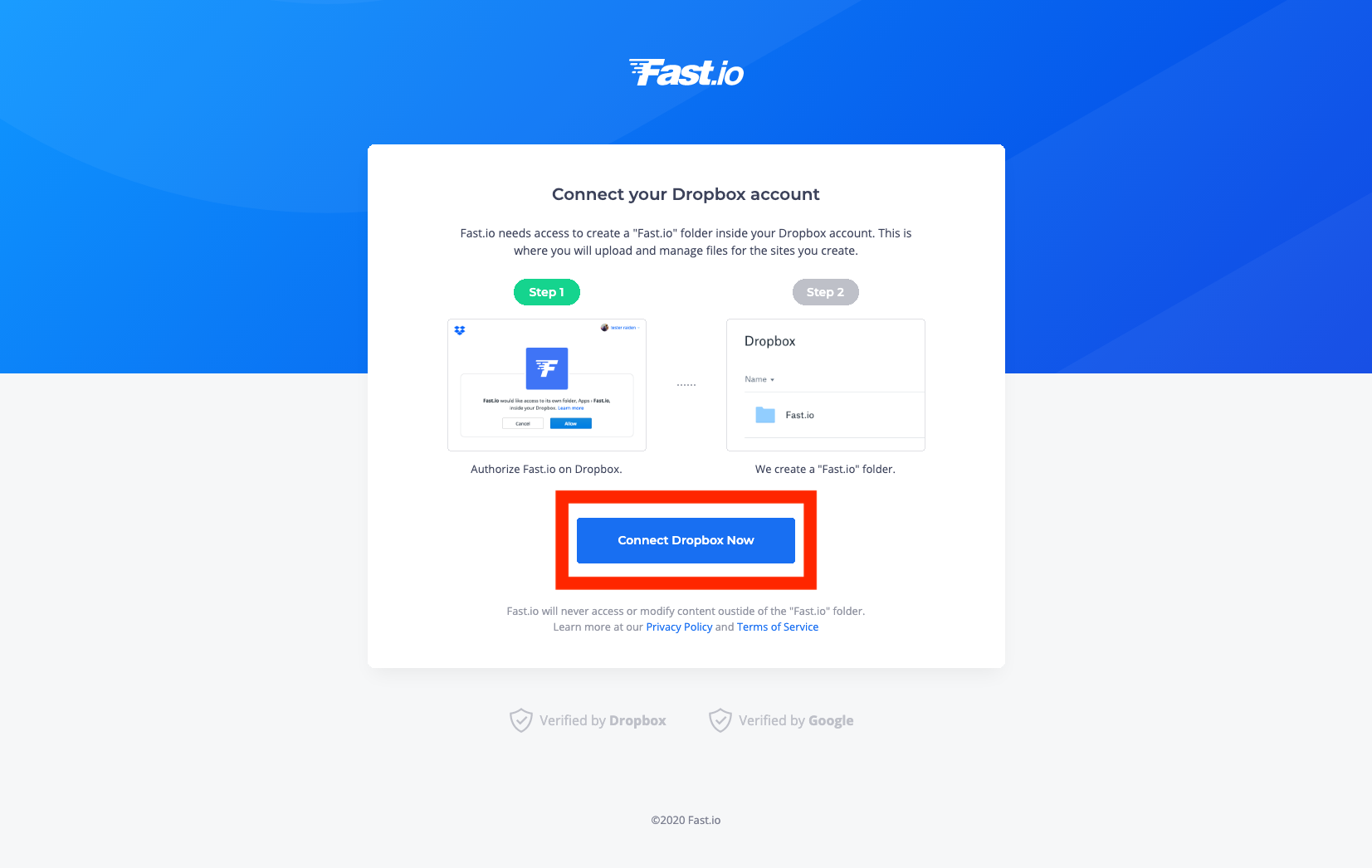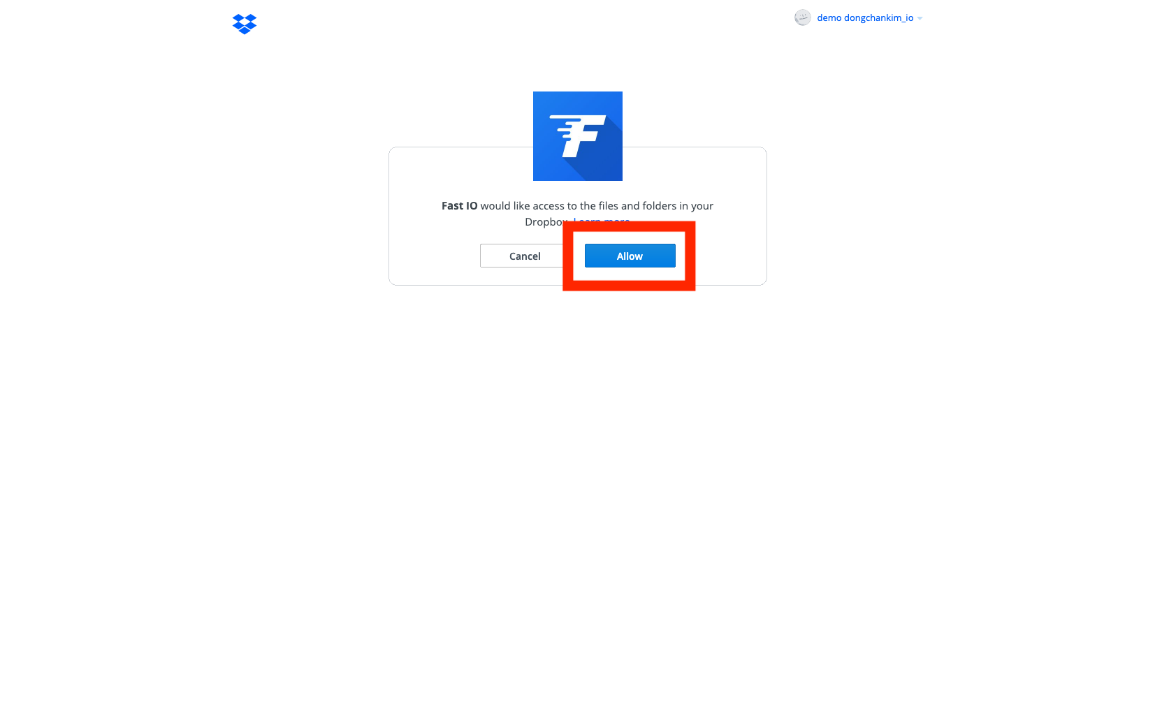 그러면 자기들이 어떤 일을 할지에 대한 설명을 해준다. 사용자가 승인을 해주면 자기가 fast.io라는 폴더를 드롭박스에 만든다는 소리. 어차피 다른 옵션은 없으니 승인!! 클릭 "Connect Dropbox Now" 버튼.