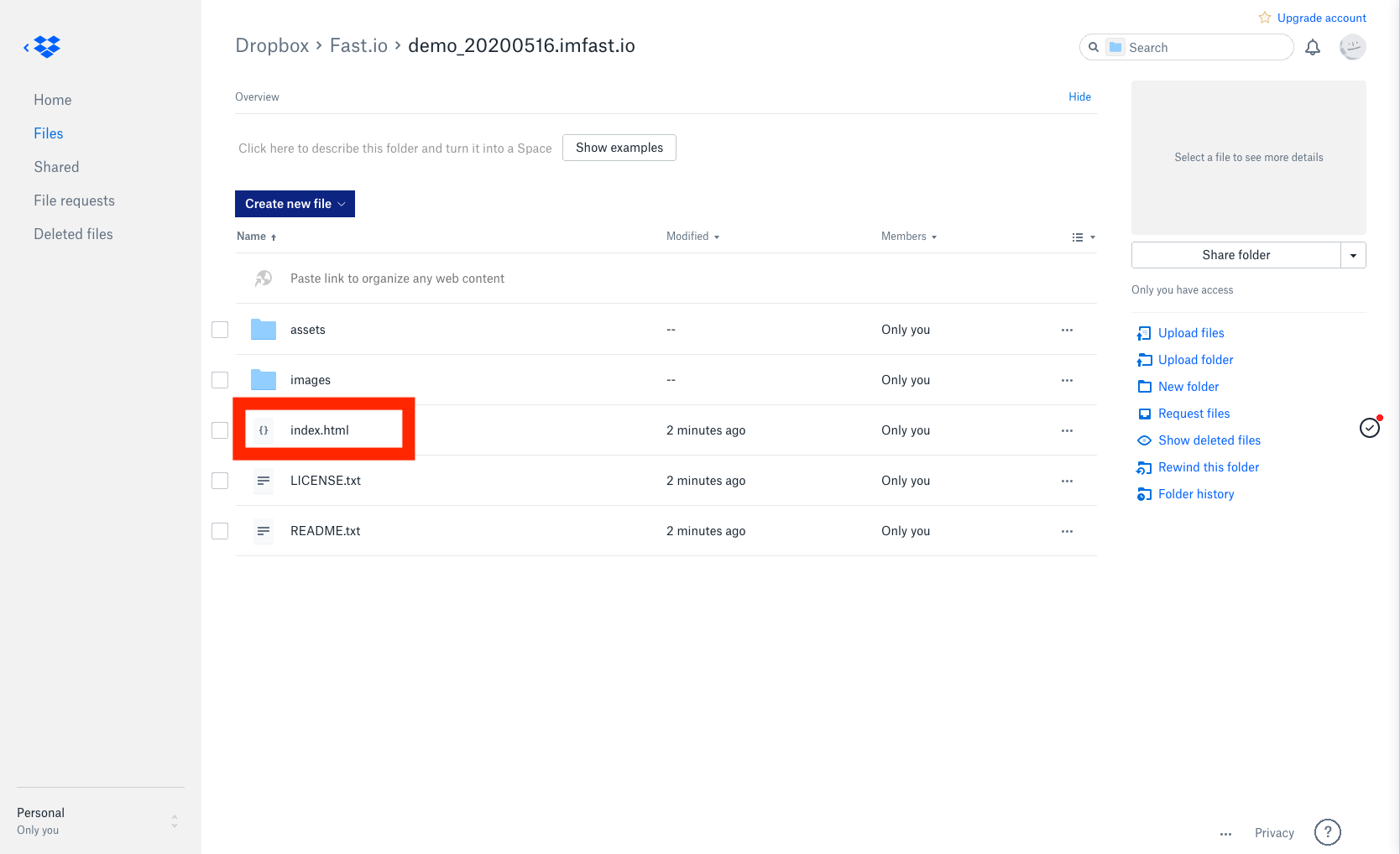 이제 이 파일들을 Dropbox에 올려주면 된다. 3번째 이전의 화면에서 누른 "Open Dropbox Folder" 버튼이 아마 dropbox웹페이지를 열어뒀을 것이다. 하지만, 새로 창 열어서 dropbox열어도 똑같다. 아래 처럼 fast.io폴더로 이동하면 본인이 선택한 웹사이트 주소로 명명된 폴더가 보일 것이다. 그 폴더를 더블클릭하여 폴더로 이동.