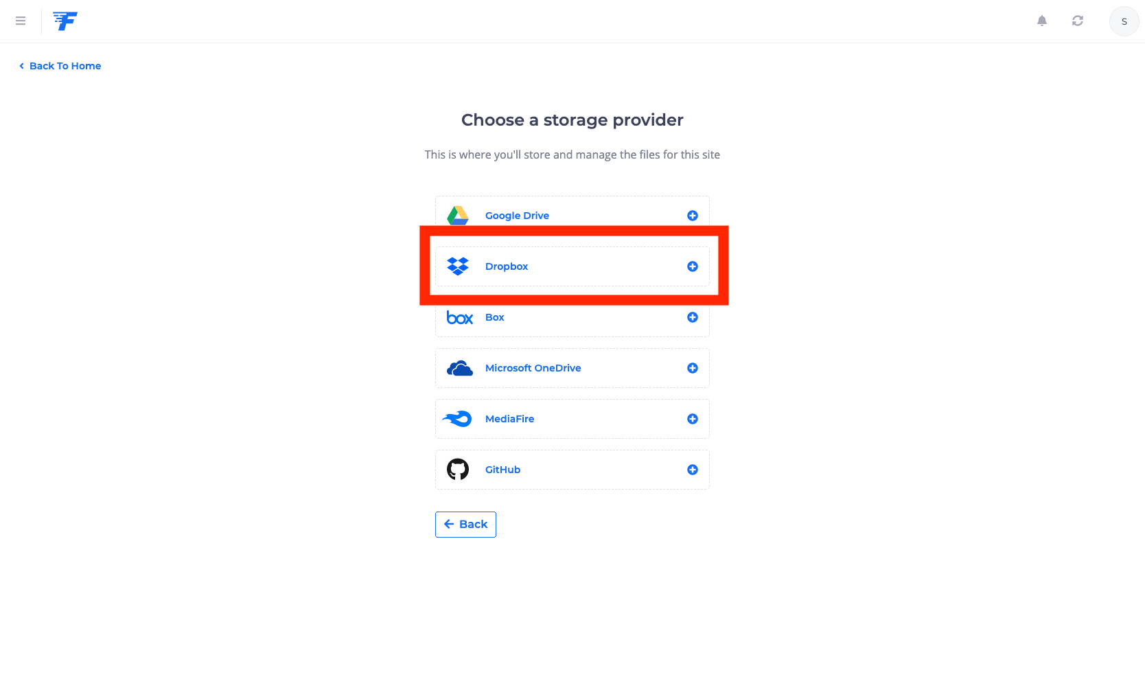 다음 화면은 연결된 클라우드 서비스 (storage provider) 선택하는 화면. 우리는 드롭박스 쓰기로 결정했으니 Dropbox 클릭. (역시나 빨간 상자로 하이라이트 한 점은 ㅈㅅ)