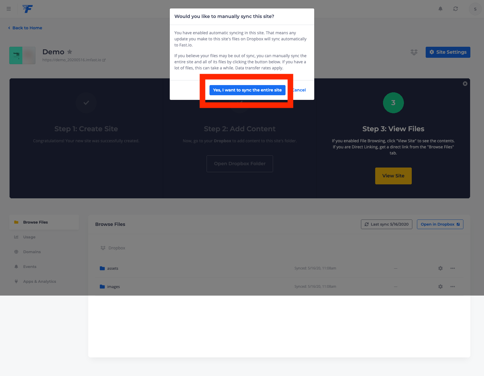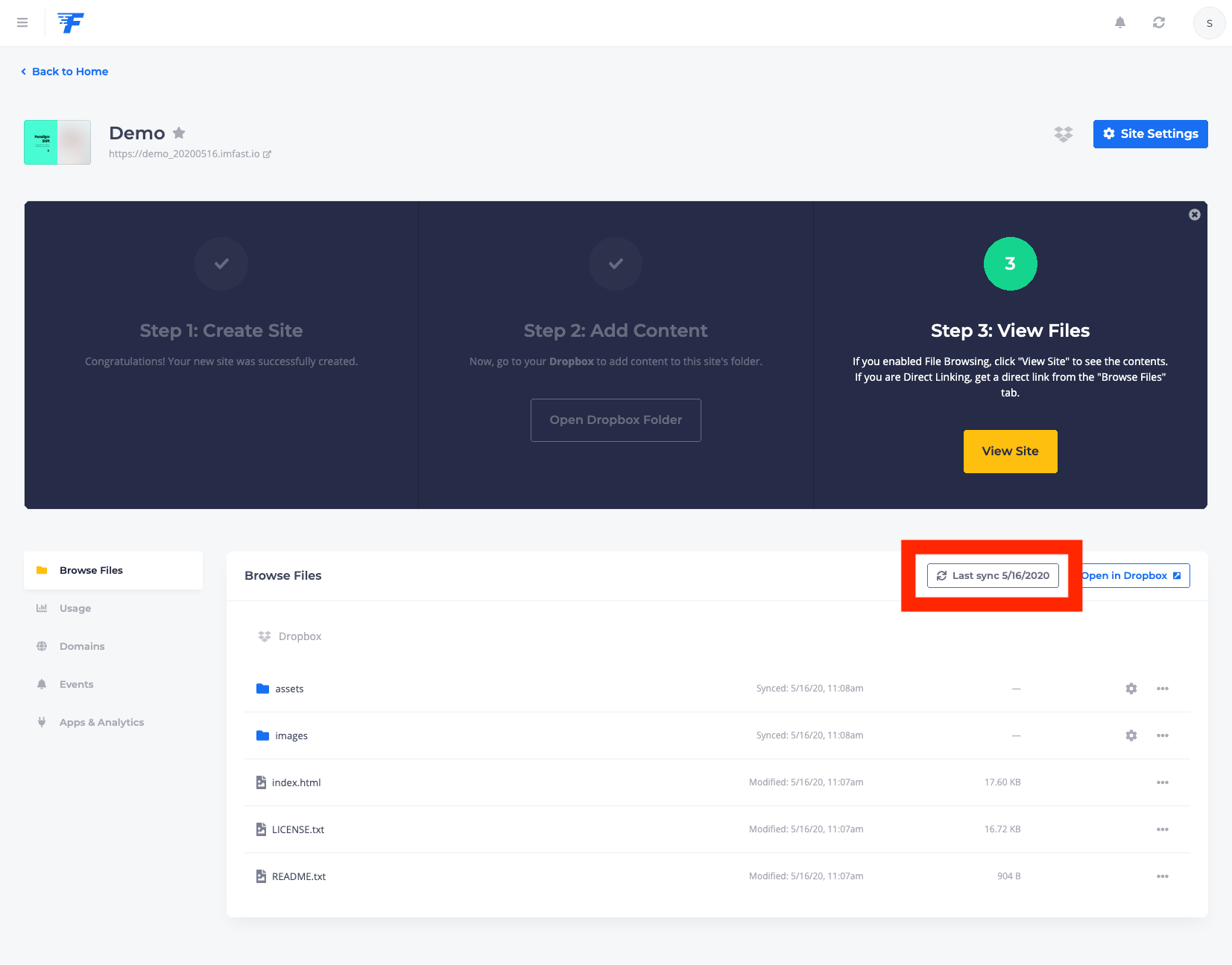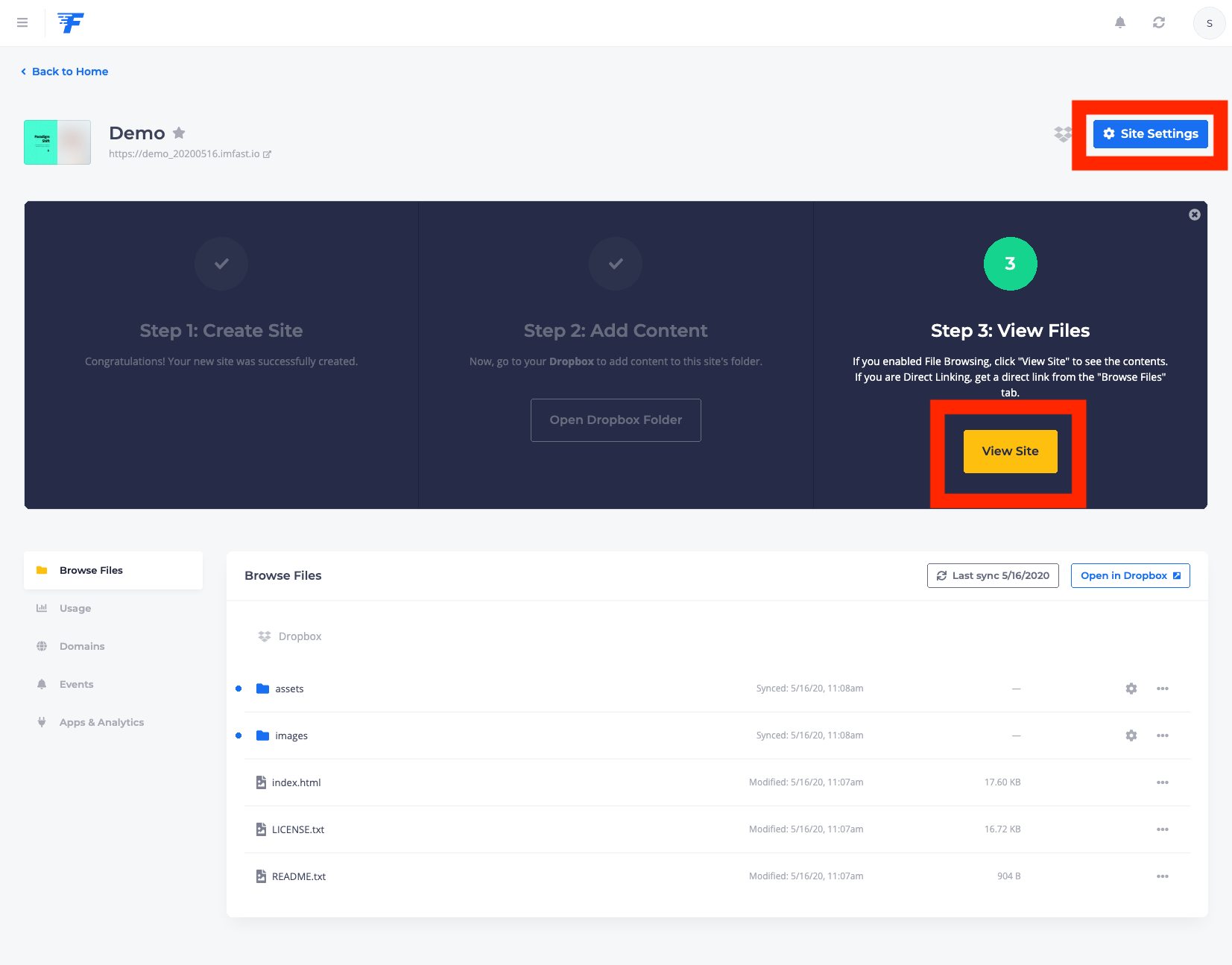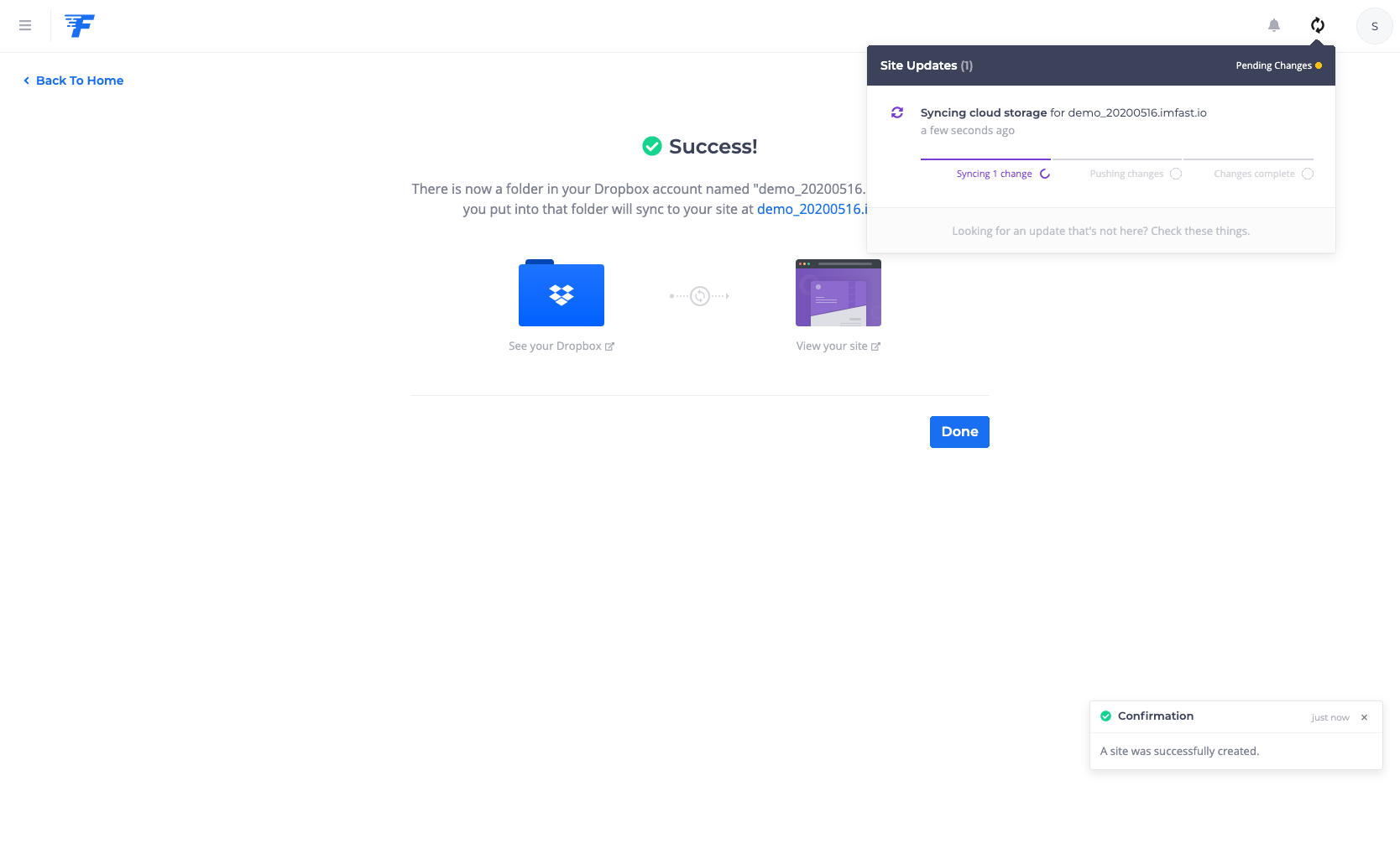 이제 클라우드 서비스랑 fast.io랑의 연결은 성공. 이제 어떤 사이트를 만들지 묻는 화면으로 넘어간다. 나는 demo_20200516이라는 사이트를 만든다고 설정했다. 이러면 최종적으로 홈페이지 주소는 https://demo_20200516.imfast.ion 가 된다. (이 설명서 작성 후에 사이트는 제거했으니 저 주소로 가봐야 뭐 안보일꺼다) "Create Site" 버튼 눌러 사이트 생성!!