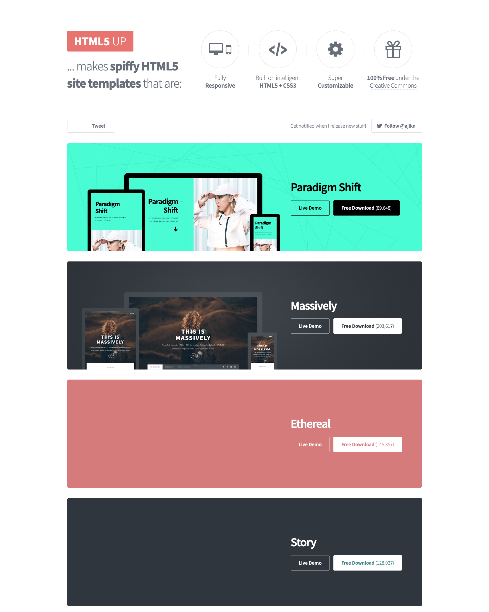 이제 홈페이지 파일들을 올려야 하는데 이미 홈페이지 파일들을 갖고 있다면 그것을 올리면 된다. 우선은 설명을 위하여 공개된 웹페이지 탬플릿을 이용한다. 웹브라우저의 새창을 열어 html5up.net 로 간다. 아무 템플릿이나 상관 없다. 원하는 템플릿 옆에 있는 "Free Download" 버튼을 눌러서 다운 받는다.