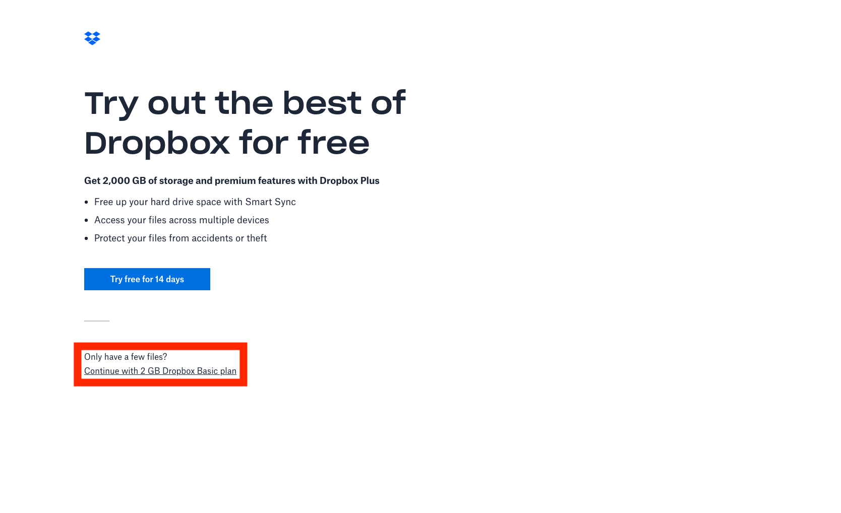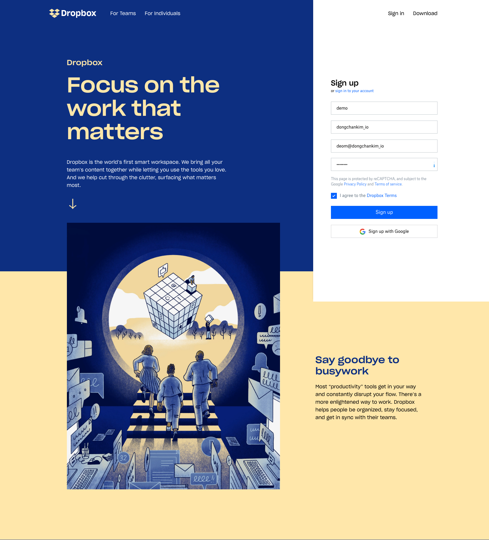 우선 dropbox.com으로 가서 서비스 가입을 해야한다. 아래가 현재 (2020/05/16일) 기준 영문 드롭박스 첫 페이지인데 한글 페이지도 구성은 비슷한 것 같다. 아래 사진에서 보이듯이 이름, 성, 이메일 주소, 그리고 비밀번호를 넣고 아래 동의한다는 체크박스에 체크를 하고 sign up 버튼을 누르면 된다.