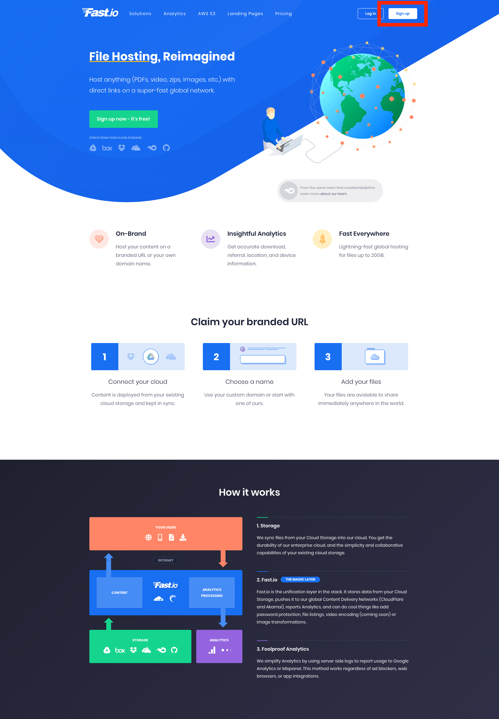 fast.io에 가면 현재 (2015/05/16) 기준 아래와 같은 첫 페이지를 볼 수 있다. 사진에서 보이는 빨간 상자안에 sign up버튼을 눌러서 가입 시작!