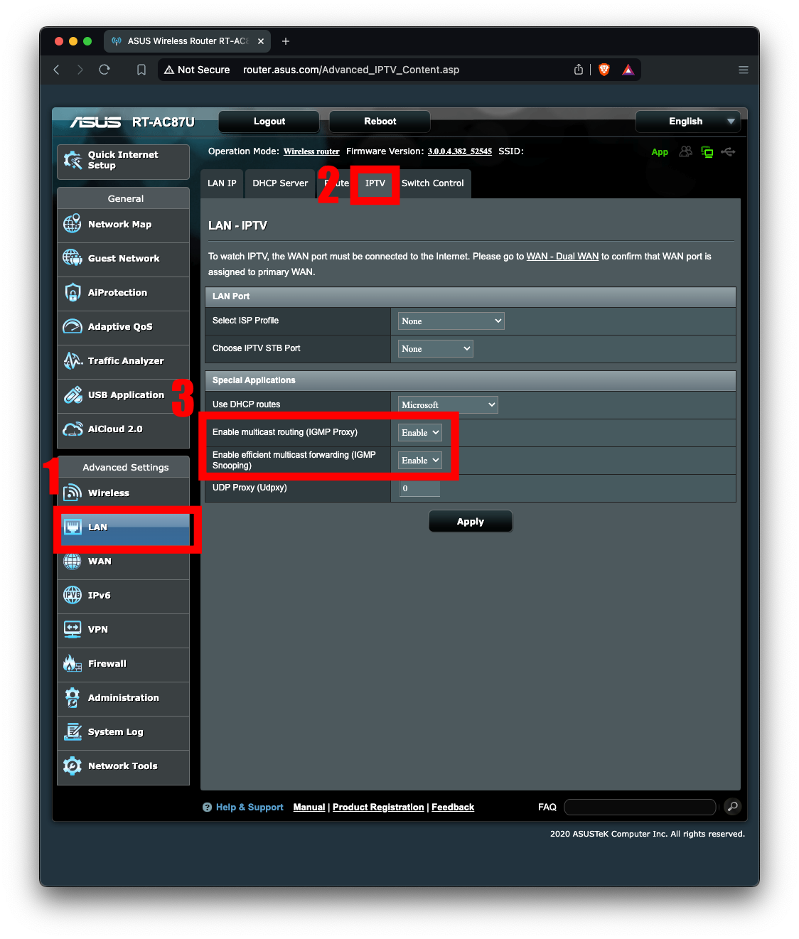 - Enable multicast routing (IGMP Proxy)를 Enable로 변경
