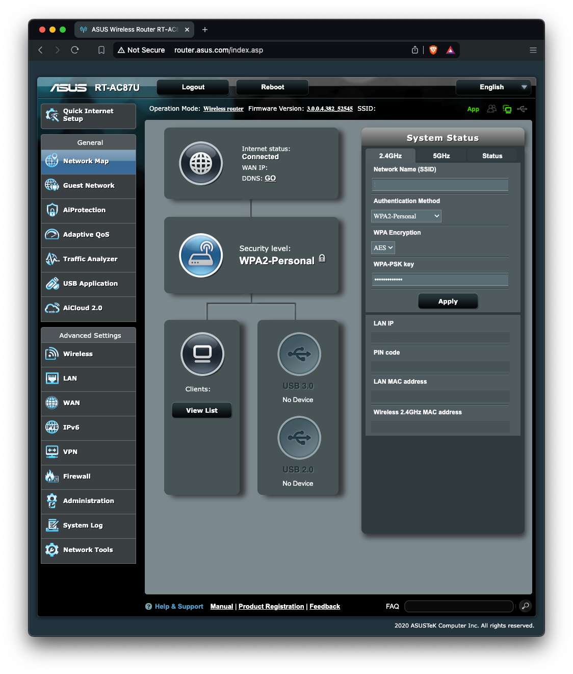 다음으로는 왼쪽 하단의 Advanced Settings 아래의 Wireless (1번 박스) 를 클릭하고 오른쪽 상단의 Professional (2번 박스) 를 클릭하여 이동한다. 아래의 화면을 보게 될 것이다.