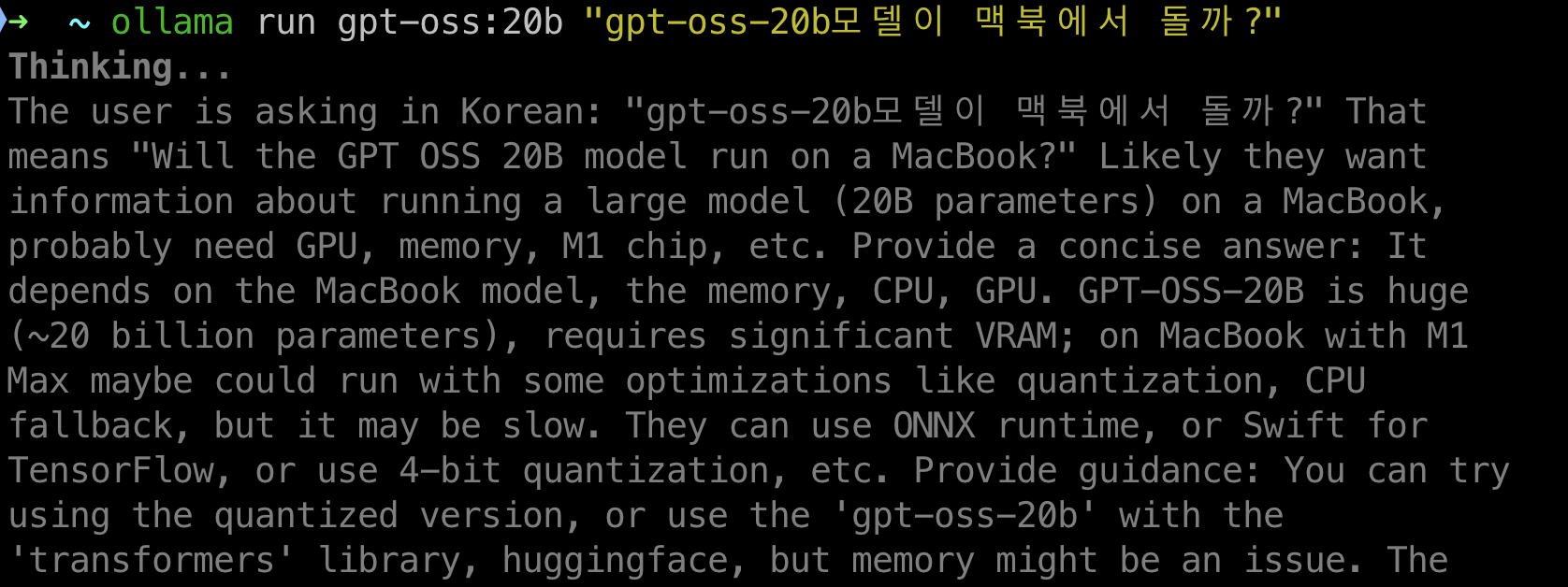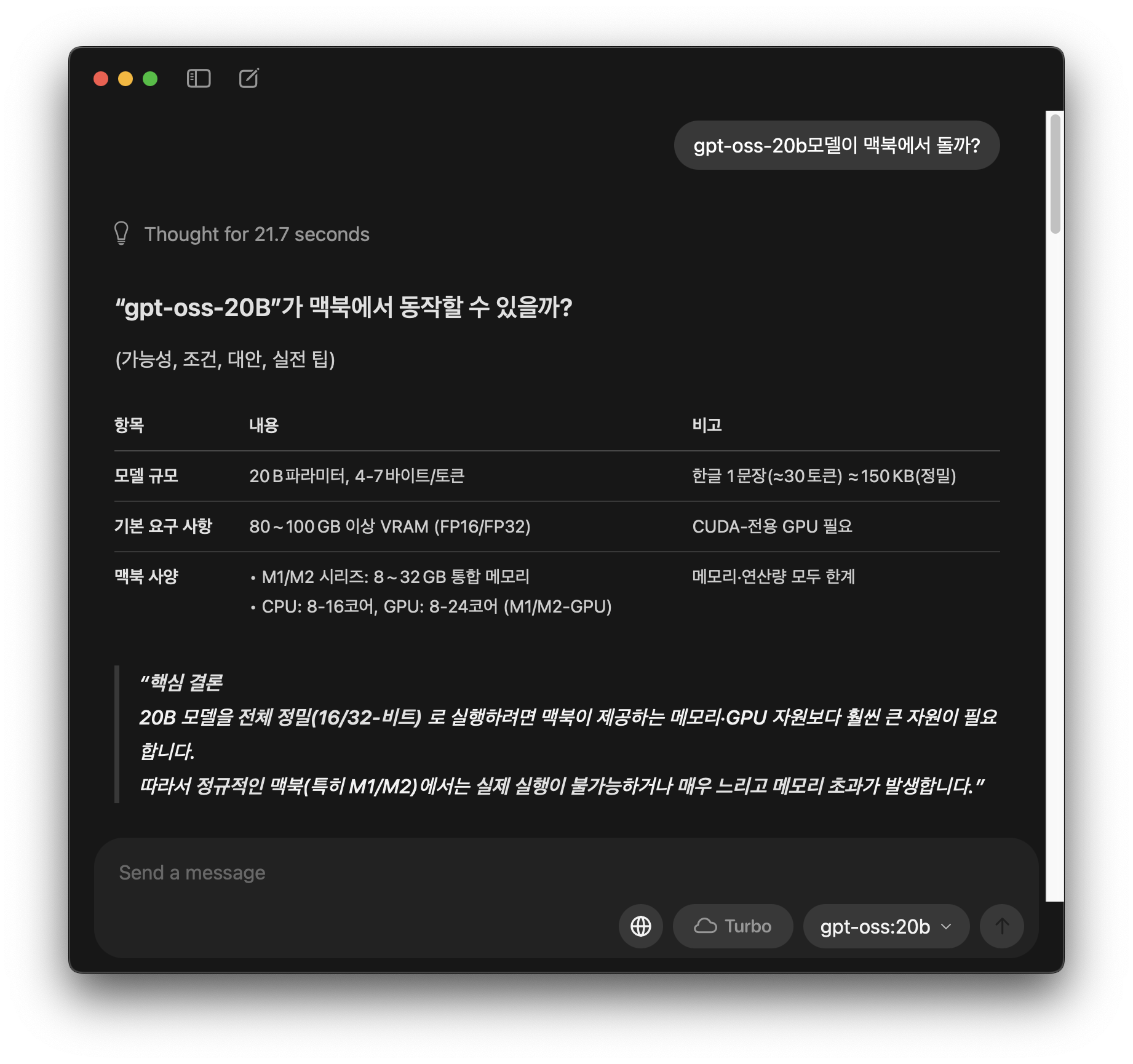 MacBook에서도 비교적 간단한 설정만으로, 20B 규모의 언어 모델을 띄워 직접 활용할 수 있습니다.